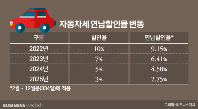 하지만 2010년대 이후 자동차세 징수율은 90%가 넘는다. 정부와 지방자치단체가 더 이상 세금할인에 따른 징수효과를 보지 못한다고 판단한 이유입니다.